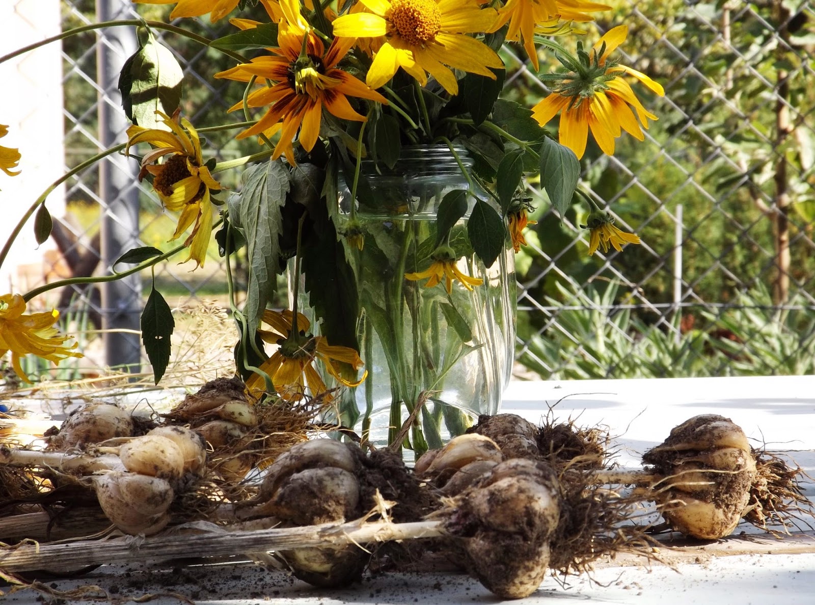 To nie były najbardziej pracowite dni tego roku, może nawet wręcz przeciwnie. Ale przycięłam winogrono obcinając zbędne, nieowocujące pędy, wykopałam czosnek, porobiłam wiązki z oregano, szałwii, mięty i powiesiłam przy drzwiach wejściowych by mi uroczo pachniały, oberwałam orzeszki laskowe, ogórki, cukinię, pomidory, fasolę, borówki, maliny.....